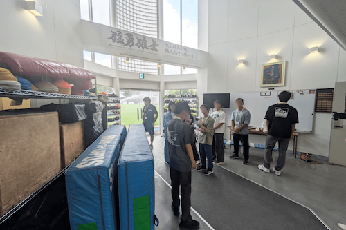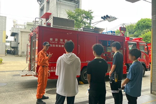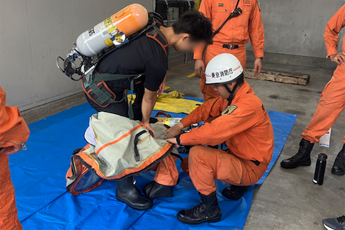 最初に、東京消防庁には「消防官」だけでなく事務職や技術職などさまざまな職種があること、そして女性職員が幅広い分野で活躍していることについて説明がありました。次に、消防学校の寮や食堂などの施設を見学し、規則正しい生活から生まれる強いチームワークが災害対応においていかに重要であるかを学びました。ハイパーレスキュー隊では、酸素ボンベの重さを実際に背負って体感したり、防護服の着用や特殊車両の内部に入るなど、ここでしかできない体験をさせていただきました。さらに、消防隊の縄の結び方など、安全を守るために普段の生活でもできる工夫も学びました。最後に育児休業を取得した男性職員との座談会が行われ、家庭と仕事を両立できる柔軟な職場環境についてお話を伺うことができました。