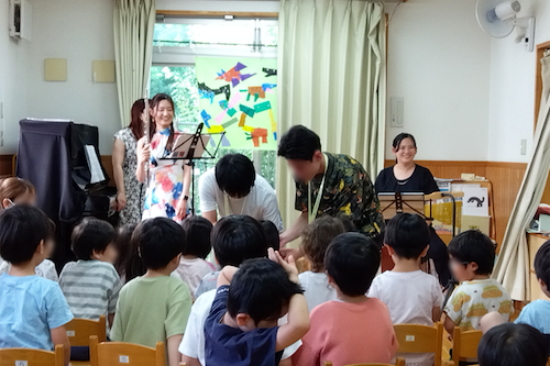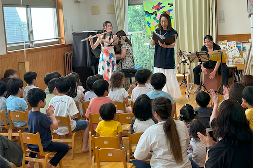 musiaのプロ演奏家の方々が年間を通じて開催している演奏会のうち、7月に開始された、保育園での園児や保護者、地域の方々に向けた「musia いつもいっしょに音楽会 ~海とお星さまのコンサート~」の運営業務を体験しました。団体の概要と活動について説明を受けたのち、現場では楽器搬入や譜面台の設置などの会場設営を行い、演奏会の途中で園児たちに楽器を配布・回収する業務などを担当しました。フルート、歌、ピアノ、パーカッションの編成による演奏会の現場では、選曲や音色、リズムによって園児の反応が変化し、曲の合間の司会進行トークにも子供たちを飽きさせない工夫が凝らされている点など、演奏会イベントにおける効果的な演出方法などについても学ぶことができました。演奏会終了後の会場撤収時には、参加者が自ら園児たちに優しく声がけする姿も見られました。