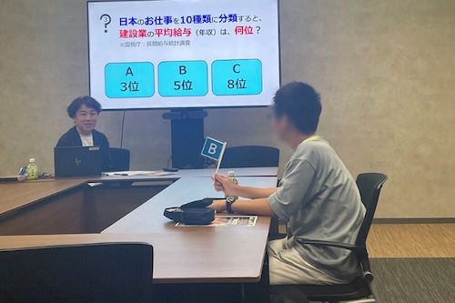 最初に、建設業界の現状についてクイズ形式で学びました。「建設業にはいくつの業種があるか」などの問題が出題され、業種の数の多さに参加者は驚いていました。その後、建設業を盛り上げる広報を目的としてクリエイティブ・ラボが制作した短編映画を視聴しました。視聴後、参加者からの感想や、どうしたらより一層魅力的な映画になるか社員の皆さんと意見交換を行いました。
