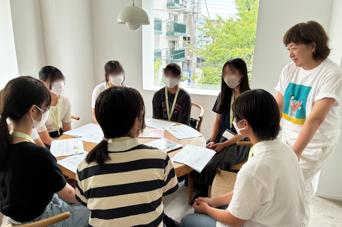 2日目はオフィスを見学し、「たまひよ」の営業職やアプリ開発職の方から仕事内容のお話を聞きました。次に自分のライフプランを考えるワークショップでは、様々なライフイベントが書かれたカードを引いて自分の人生グラフを作成する中で、将来の具体的な選択を想像して盛り上がるシーンもありました。最後は、たまひよ統括編集長と「少子化」「チーム育児」「プレコンセプションケア」をテーマにディスカッションを行いました。