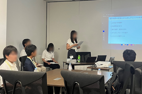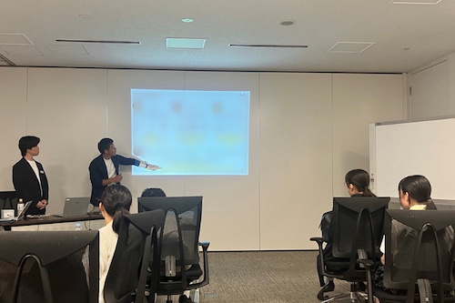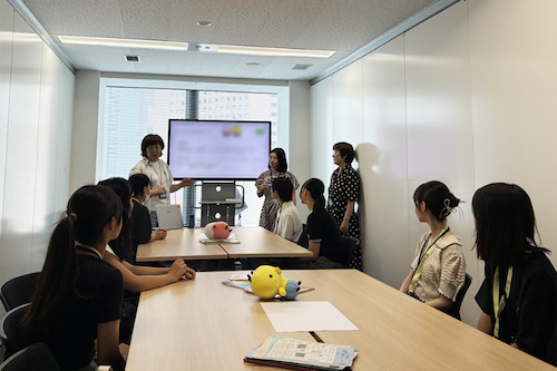 バスツアーの作り方について学んだ後、「閑散期の集客プラン」を企画するため、グループに分かれ出発地やターゲット層、テーマやコース設定についてディスカッションしました。そして、「お酒を飲みながら回る伊豆・湘南めぐり旅」と「ファミリー層とファン層を対象、アニメキャラクターと行く日帰りツアー」をプランとして発表しました。最後に座談会では、ツアーでの出来事、はとバスならではの工夫、働きがいなど、社員とお話ししました。
