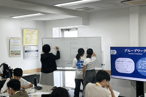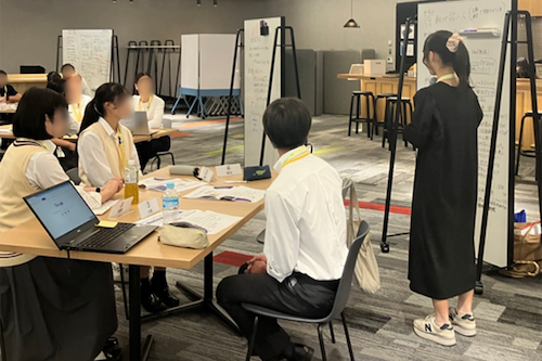 2日目は、「自分の街へ観光客に来てもらおう!」などのテーマについて、チームに分かれてデザインシンキングを実践しました。どのような人(ペルソナ)のどのような感情に対して策を講じるかを、意見を出し合いながら議論。プレゼンでは、「人混みが嫌な人に、宿泊先へ商品を届ける」といった案やその思考プロセスを分担して発表しました。最後に、協働の視点やひとりひとりがエキスパートになる重要性を学び、2日間を振り返りました。