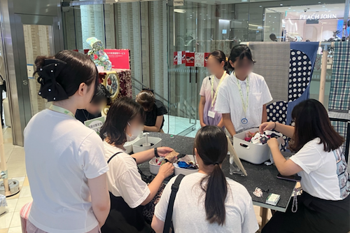 前半は会社概要やルミネのサステナビリティ活動を学びました。屋上緑化、LED照明の導入、衣料品回収とその循環サービス、カーボンフットプリントの可視化などの取組を通じて、衣料品の大量生産と大量廃棄という社会課題を知ることができました。後半はルミネ新宿で商業施設の管理運営業務を体験しました。また、回収した衣料品の端切れを使ったくるみボタン作成イベントでお客さま対応を行い、実践的な体験の機会となりました。