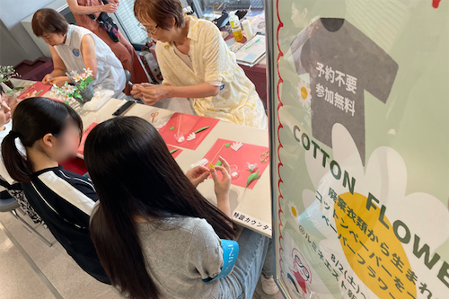 ルミネエスト新宿のサステナビリティ施策を学び、JR東日本の鉄道林の間伐材を活用したアロマオイルを使用しているスタッフ休憩室を訪問してその取組に触れました。また、廃棄されるコットン製品から作られたコットンペーパーを使用してペーパーフラワーを作成し、衣料品の循環を体験しました。最後に、体験を通じて得た知識をもとに、衣服に関する社会課題について多くの人に知ってもらうためのアイデアを企業へ提案しました。