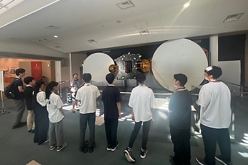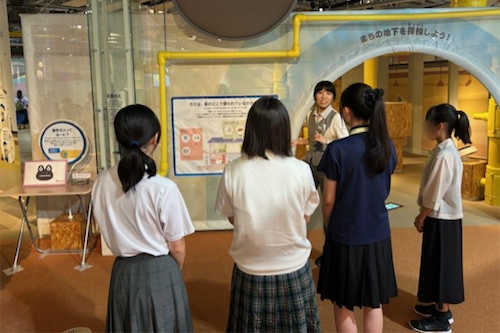 「がすてなーに ガスの科学館」の施設概要説明の後、館内を見学しながら人気イベントのクイズ大会にも参加し、暮らしを支えるエネルギーの特長や地球温暖化などの社会課題を楽しく学べる体験型施設として、展示やイベントを工夫していることを知りました。また、来館者との接し方や心構えなどコミュニケーターの仕事について学びました。その後、受付の様子を見学し、お客様対応として受付でアンケートを回収する業務を体験しました。
