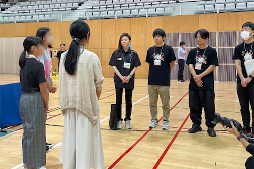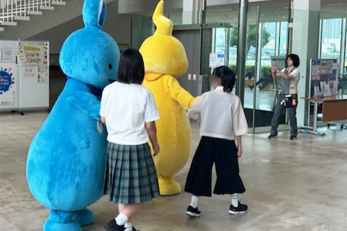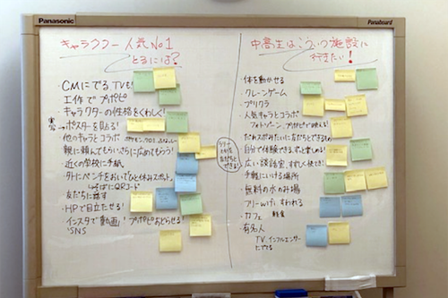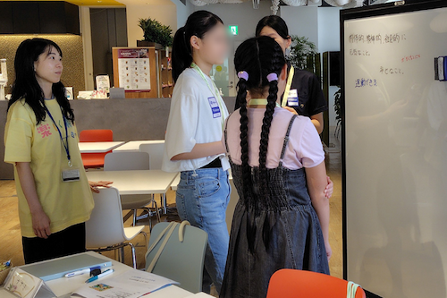 2日目は、お客様アテンドで心がけることのレクチャーを受けた後、来館者にパンフレットやアンケート冊子を配布したり、来館者がキャラクターと記念写真を撮る際の会場整理の業務体験をしました。その後、「キャラクター人気No.1になるには」「中高生はこういう施設に行きたい」というテーマでディスカッションし、キャラクターの性格を詳しく設定、一緒に写れるフォトゾーンなど、中高生の自由な発想で提案を行いました。