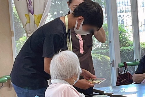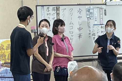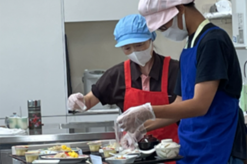 デイサービスの利用者に向けたレクリエーションの補助を体験しました。折り紙で浴衣を折る方法を各テーブルを回りながら丁寧に説明し、少し複雑な折り方でしたが、利用者の皆さんと一緒に楽しく取り組むことができました。また、昼食の配膳作業の体験では、職員の方の指導のもと、注意深く正確な配膳を心掛けました。利用者から多く声をかけていただき、楽しくコミュニケーションを取りながら介護の仕事を体験することができました。