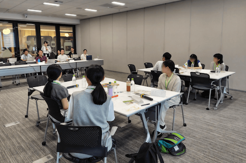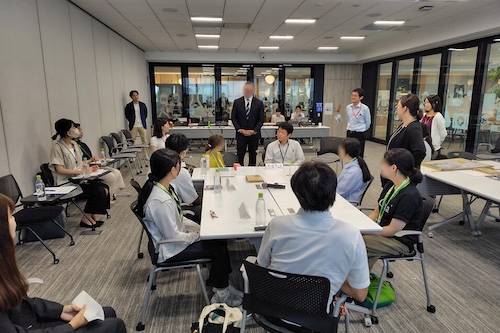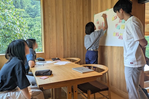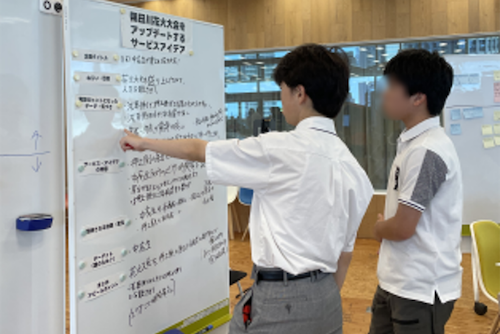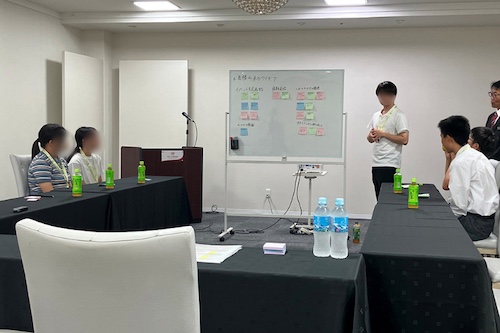 1日目に引き続きグループでアイデアをまとめました。一つ目のグループは、認知症予防を目的に思春期のデジタル育ちの若者と高齢者をマッチングして短期の共同生活を行うサービスを提案、もう一つのグループは、親にも先生にも相談できない若者が気軽に相談できる専用サイトを提案しました。その後、育児と仕事の両立をテーマに職員の方との交流会を行いました。参加者からは、先生や親以外の人の話は普段聞けないのでとても新鮮、との声がありました。
