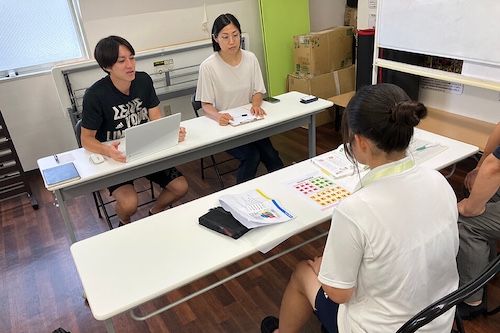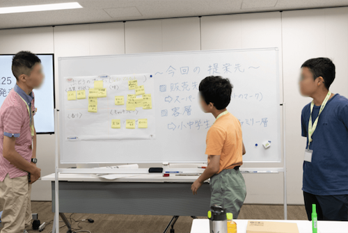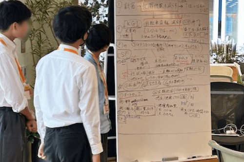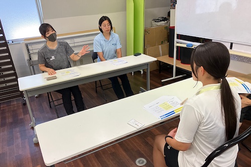 2日目は商談体験から始まりました。名刺交換や商品のプレゼンテーション方法を教えてもらいながら体験し、商品の良さを言葉で伝える大切さと難しさを学びました。後半は、マスセットが行う地域の子供に向けたイベントの説明を聞き、さらに発展させるアイデアを参加者でディスカッションしました。なかには保育園・幼稚園事業を展開するのはどうかといった意見まであり、中高生の自由な発想に社員の方も感心していました。