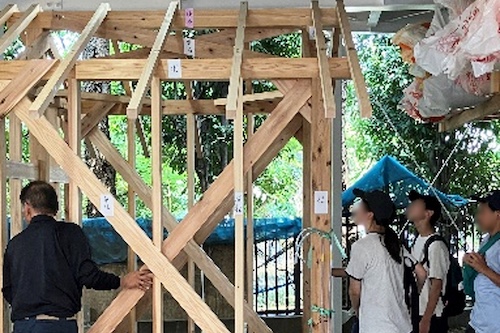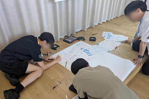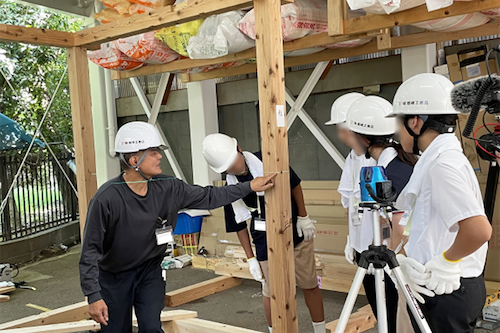 初日の体験を踏まえ、実際の家づくりの工事の流れを職人さんに解説していただきました。その後、3人の職人さんから大工の仕事の苦労や やりがいについてお話を聞きました。中高生たちは、仲間と協力して取り組む楽しさや、完成した時の達成感について、お話に聞き入っていました。最後に、未来の住宅にあったらいいと思う機能についてディスカッションし、発表を行いました。