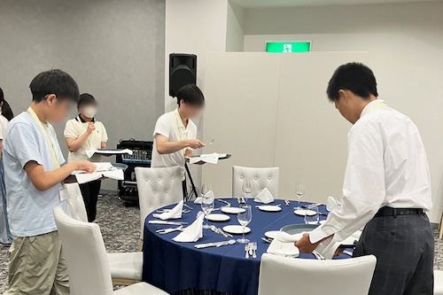 最初にホテル内を見学し、複数のタイプの客室や大小さまざまな宴会場、チャペル、スカイレストランなど、詳しく説明していただきました。次に、ホテルの地域社会での役割についてお話を聞いた後、テーブルマナーの基礎知識をクイズ形式で学びました。最後に宴会場のテーブルセッティングの体験では、役割分担をして協力しながら1つのテーブルを完成させるという、ホテルならではの仕事を体験しました。
