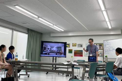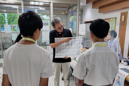 毎月実施されている運営委員会議について説明を受けた後、そこでの議題に挙がる、現在は時間制限のある「小中学生によるロビーの使用」について、一人ずつ意見を発表しました。また、初日の業務体験を踏まえて、コミュニティセンターの運営改善として、会議室予約をスマホで簡単にできる仕組みなどを提案しました。センター側からは「中高生のアイデアをヒントとして役立てていきたい」というコメントもあり、活発な意見交換が行われました。