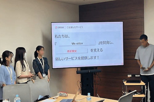 生命保険の基礎知識など事業内容の説明を受けた後、オフィス内を見学しました。その後、「日本生命の新しいサービスを企画しよう」というテーマで、グループディスカッションに取り組みました。まず自分自身のライフステージに存在するリスクや不安を洗い出し、様々な人生の局面で必要とされる支援や安心感を具体的に把握した上で、新しいサービスのアイデアをライフステージ毎にまとめました。