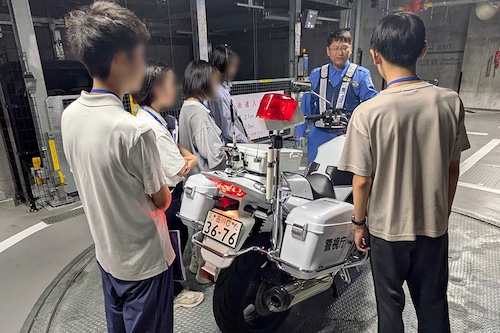 最初に署内全体を案内してもらい、地域的な特色や、各部署で業務等の説明を受けました。その後、白バイの乗車体験や、防刃ベストの装着、護身術体験、無線でのやり取り等、様々な体験を行いました。また、災害救助や被災時に役立つテクニックについても教えてもらいました。昼食時は職員の方々と歓談し、仕事内容や警察官になったきっかけ、これまでのキャリア等を聞きました。午後は交番勤務を体験し、その中で防犯用の意識啓発チラシを入れたティッシュ配りやパトカー乗車体験を行いました。署に戻った後は鑑識の業務について紹介してもらい、指紋の採取方法等を教わりました。警察官の福利厚生について教えてもらった後、最後は署長との座談会が開かれ、笑い声も聞こえる穏やかな雰囲気の中、参加した中高生から質問等を行いお話を伺いました。