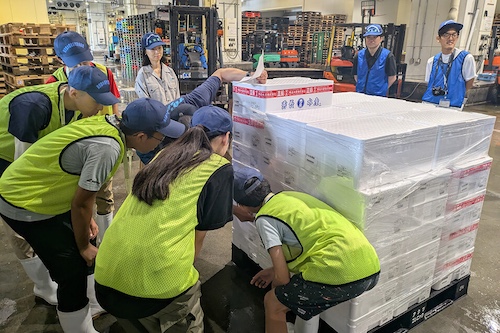 最初に世界最大級の豊洲市場の役割と仕組み、機能について説明を受けました。その後、マグロ等の卸売場、水産仲卸売場、ドックシェルターなど閉鎖型の施設内を見学し、活魚が泳ぐ水槽で実際に水温の違いを体感するなど、市場の品質・衛生管理システムについて学びました。その後、「ターレ」と呼ばれるフォークリフトで荷物が運ばれる様子を見学したあとに、水産物の積み付けの積荷検品作業を体験しました。
