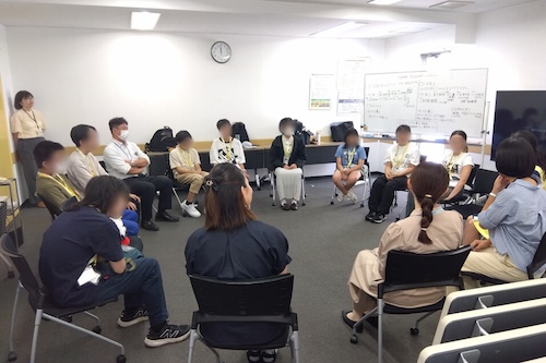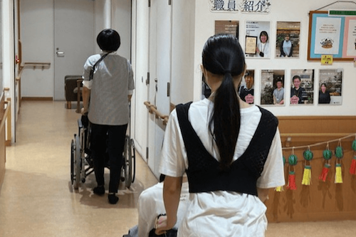 最初に会社概要と事業内容の説明を受けた後、介護士の仕事やどのように介護士になるかについて実体験を交えながら教えてもらいました。次に、車いす体験を行い、実際に車いすに乗って介助される側の視点を体験するとともに、介助される側が安心できるような車いすの押し方を学びました。その後、施設見学をしてから、最後は子ども食堂のイベント企画のアイデア出しをして、1日目は終了となりました。