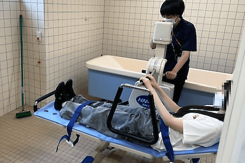 2日目は子ども食堂の運営体験から始まりました。入所者の方々や同世代の高校生ボランティア、参加している子供たちとともに折紙で花盛りを作り、食堂の飾りつけを行いました。その後はハロウィンの時期に開催される子ども食堂のイベントのアイデアを出し合い、企画作りに取り組みました。また、浴室リフトの体験もあり、ケガをしないように入浴してもらう方法についても学びました。