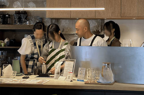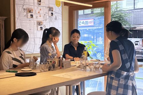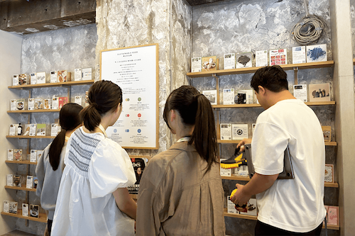 会社の取組のお話を聞いた後、Sustainable Food Museumの展示を見学し、サステナブルフードに関する様々な製品等について解説をいただきました。玉ねぎの皮から作られた調味料や、コーヒーかすから生まれたスニーカーまで、多様で豊かなサステナブルフード製品に参加者は興味津々でした。併設するカフェの運営体験では、注文を受け、ドリンクをつくり、お客様への配膳に挑戦しました。お客様へ提供する際の商品の説明の仕方など、お店の方から具体的なアドバイスをいただきました。